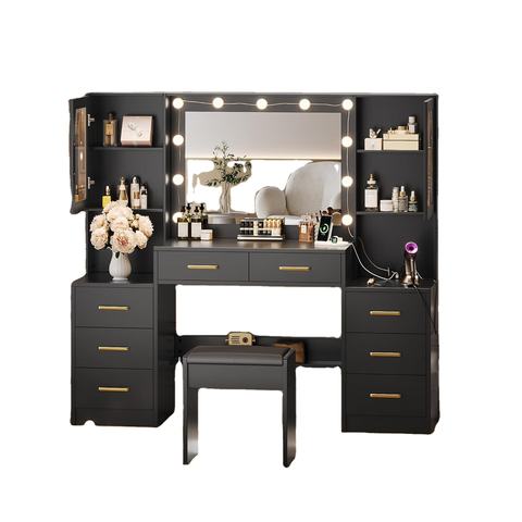 ミラー付きブラックバニティデスク,ライト,照明モード8引き出し付きメイクアップデスク,ドレッシングテーブルライト付きバニティセット